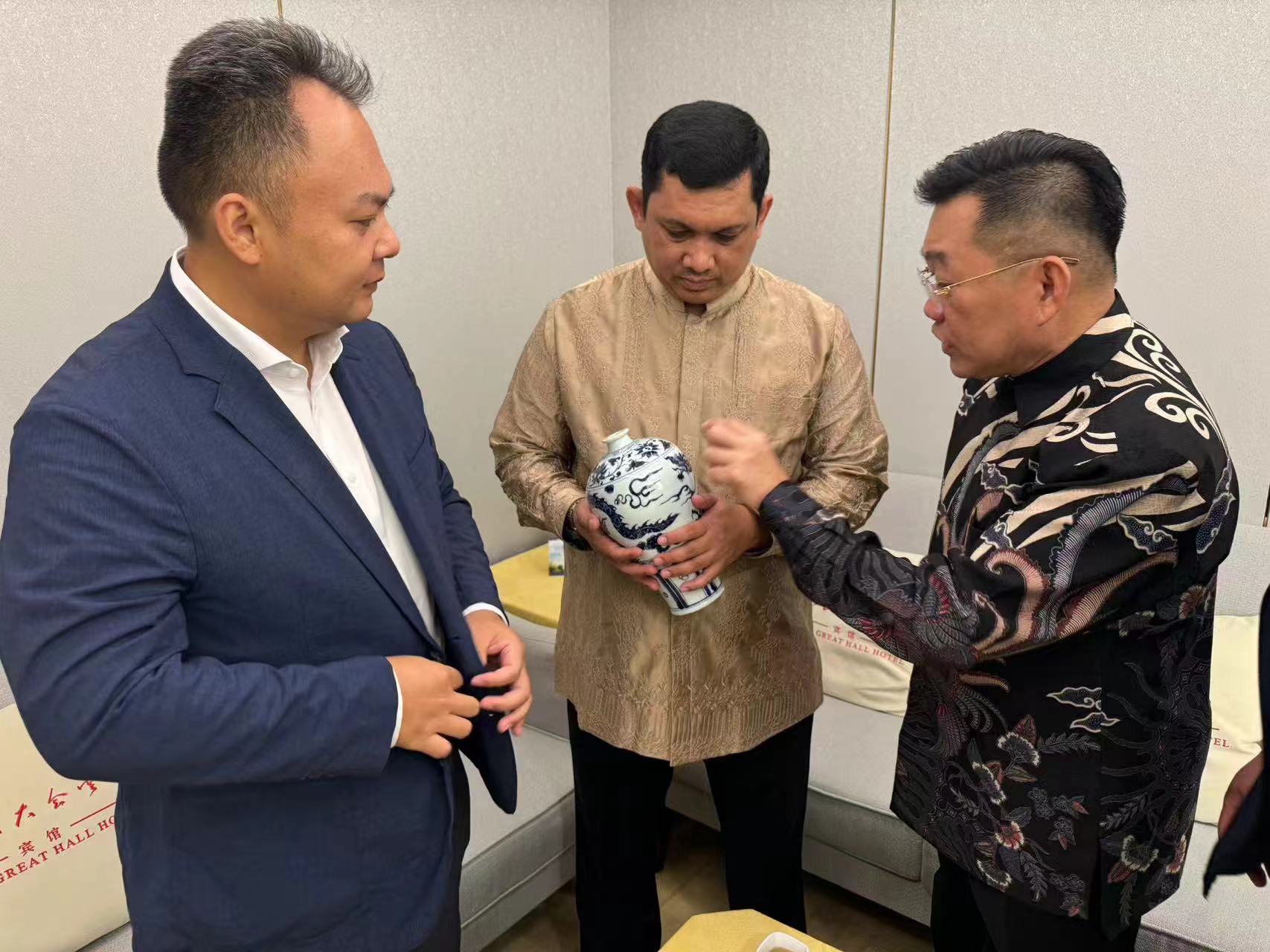 赵章对国王陛下及拿督的到来表示热烈欢迎,分别向国王陛下及拿督赠送了中国景德镇国家级大师徐遵华老师的作品。